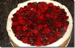 Assembling the layers: I froze the top layer to make it easier to handle, and it was a good thing that I did. Unfortunately, I didn’t notice until I had assembled the tier with frosting and cherries, that the top layer had a deep gouge in it. Because the top layer was partially frozen, I was able to lift it off with a super-sized spatula.